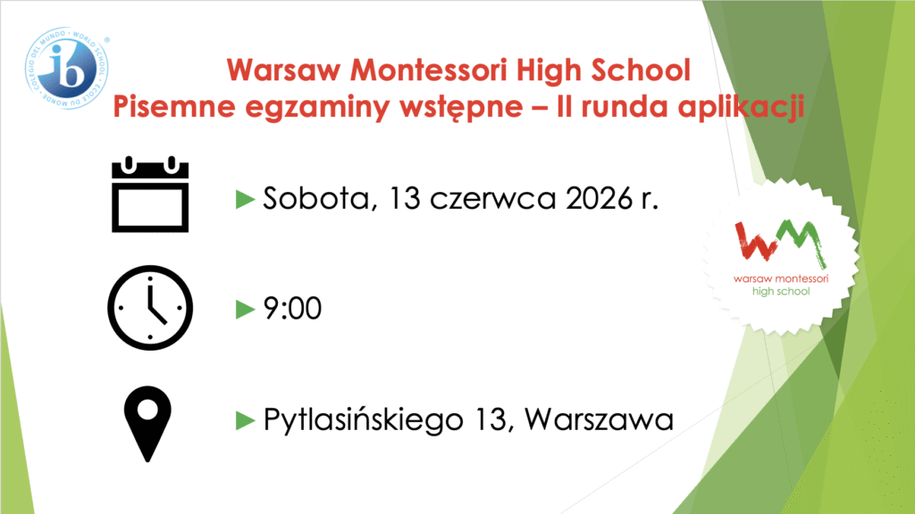 W ramach procesu rekrutacyjnego do programu IB DP w Warsaw Montessori High School uczniowie zobowiązani są do wzięcia udziału w egzaminach pisemnych i egzaminie ustnym.